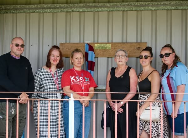 A very special and memorable occasion at our home game against Erith Town with the unveiling of the plaque in memory of Chris Taylor (photo shows John Wills, Hayley Clout Kerry from KSS, Amy and Sarah Millard accompanying Chris’s partner Jan.) Thanks to the many other fans who were also present for the ceremony.